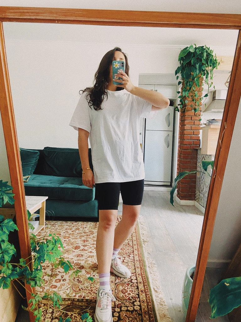 El formato es oversize, hombros caidos y largo por arriba de la rodilla. El material es 100% algodón 30/1, esto último significa que la tela es de un grosor medio, ni muy pesada ni muy liviana, ideal para los días de pegote en enero. Al ser 100% algodón se trata de unaprenda super fresca, un aliado contra el calor y la humedad digamos.