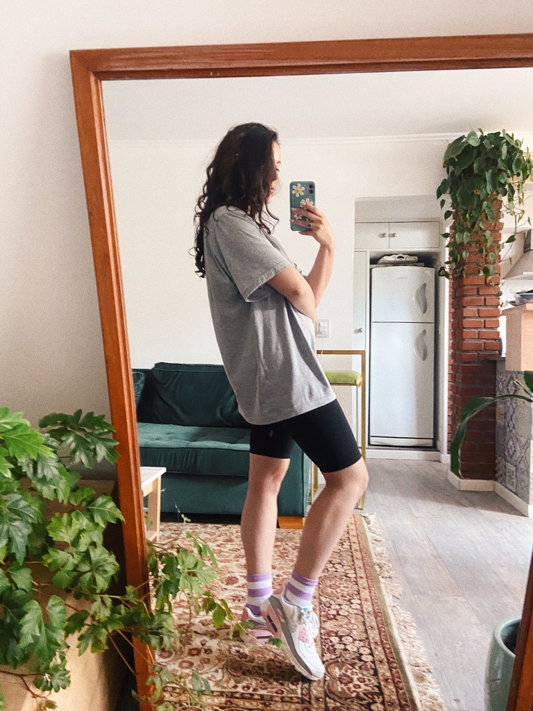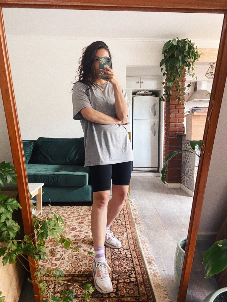 El formato es oversize, hombros caidos y largo por arriba de la rodilla. El material es 100% algodón 30/1, esto último significa que la tela es de un grosor medio, ni muy pesada ni muy liviana, ideal para los días de pegote en enero. Al ser 100% algodón se trata de unaprenda super fresca, un aliado contra el calor y la humedad digamos.
