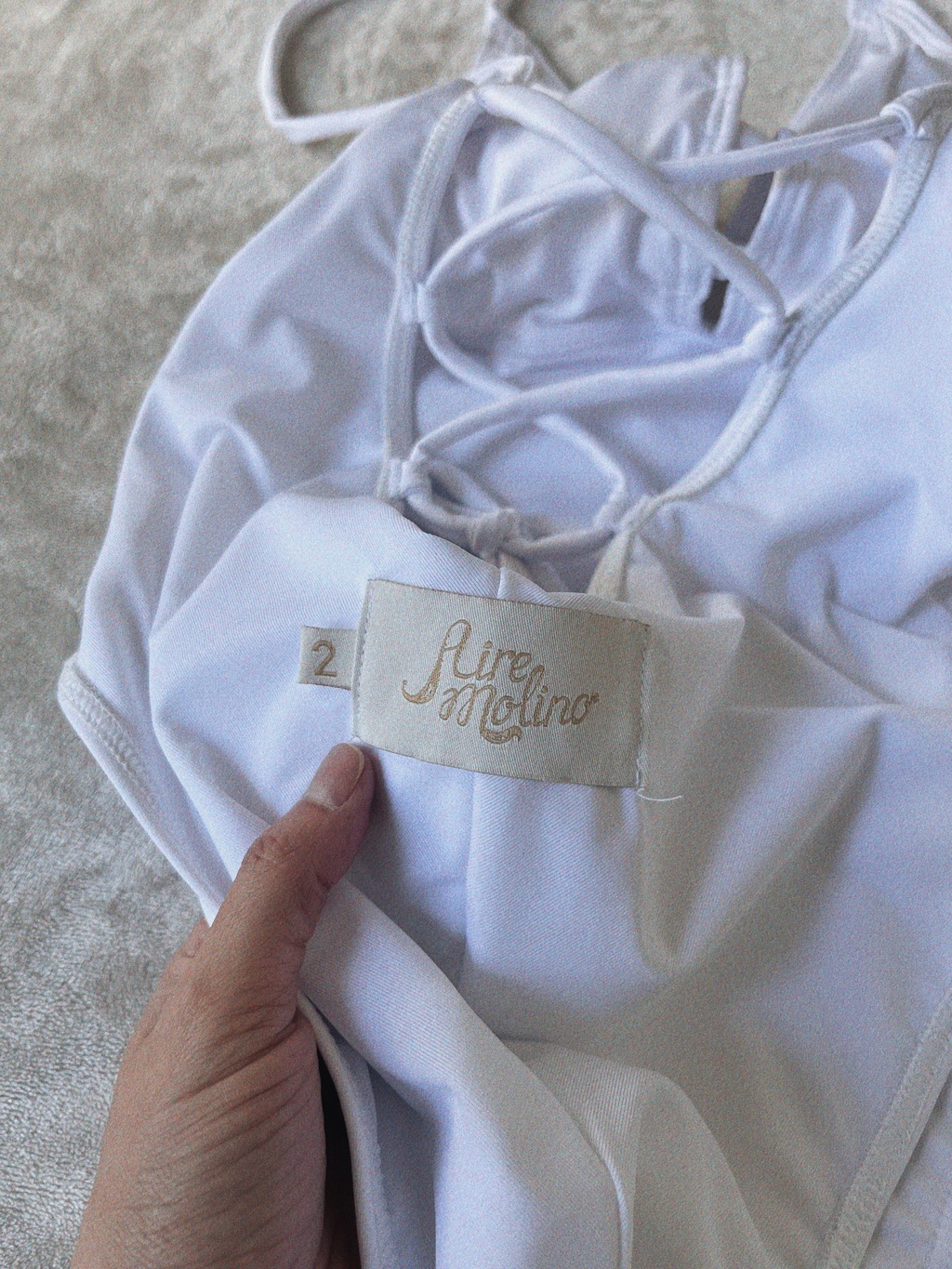 El talle se ajusta con tiras y en la parte interna de la prenda hay elásticos (que se pueden ver en las fotos) que hacen de contención para que la parte delantera quede bien pegada al bajo busto logrando muy buen soporte.