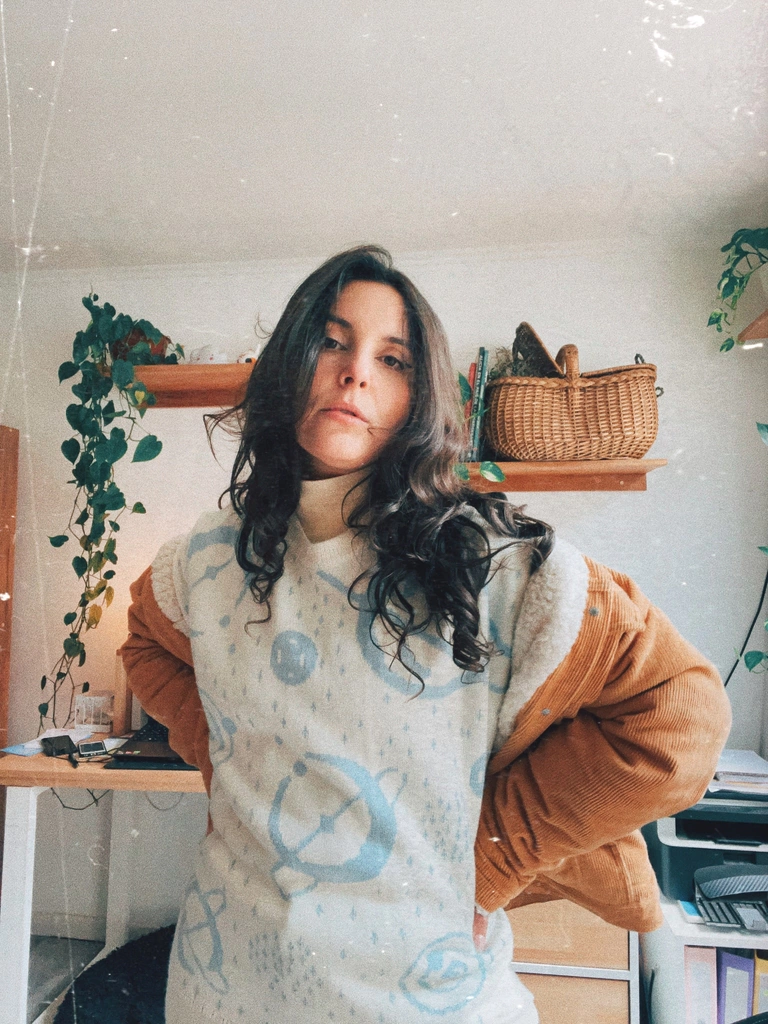 Confeccionada con 50% de lana natural y 50% lana acrílica. Es una prenda super suave y respirable , esta es una de las características hermosas del material (además de la durabilidad). El corte es oversize, tiene los hombros caidos y mangas largas y anchas. Los puños son dobles para que sean mas gorditos.