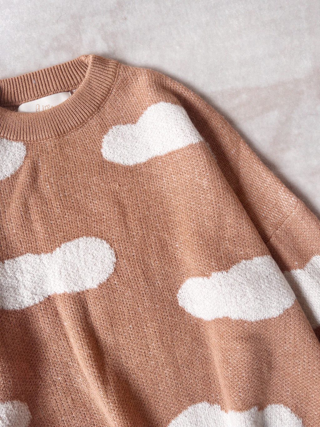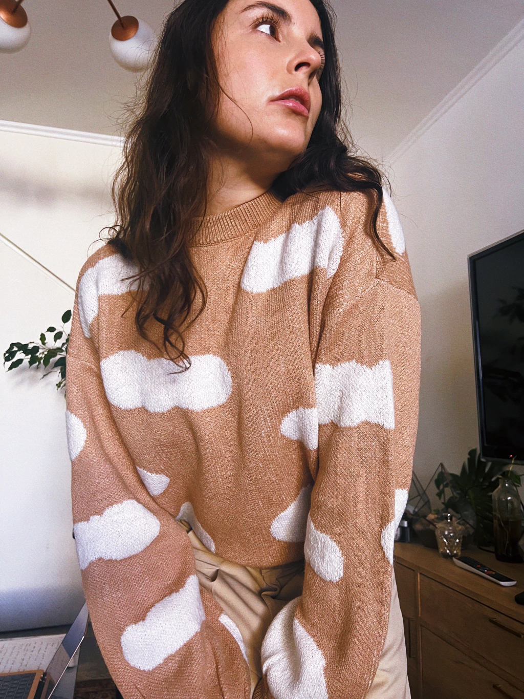Es un sweater confeccionado en lana mohair. La textura del tejido de nubes hace que estas resalten y se vean mas peluditas. Es super liviano, suave y calentito ya que está tejido con lana natural. Y viene en 5 talles.