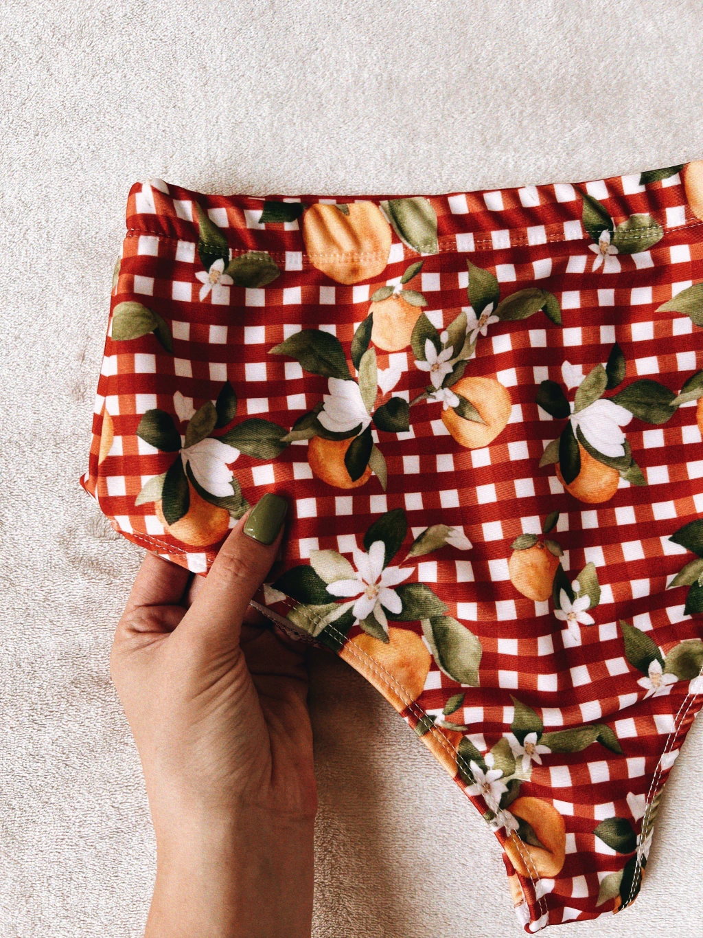 La prenda fué confeccionada en Mar del Plata. El corte es tipo culotte tiro alto, el molde está diseñado para seguir la forma del cuerpo en el calce trasero. El elástico de la cintura es ancho, de 2,5 cms.