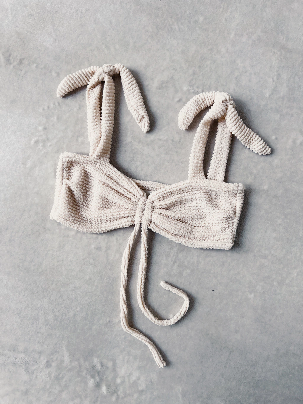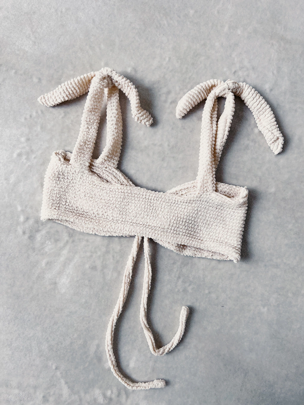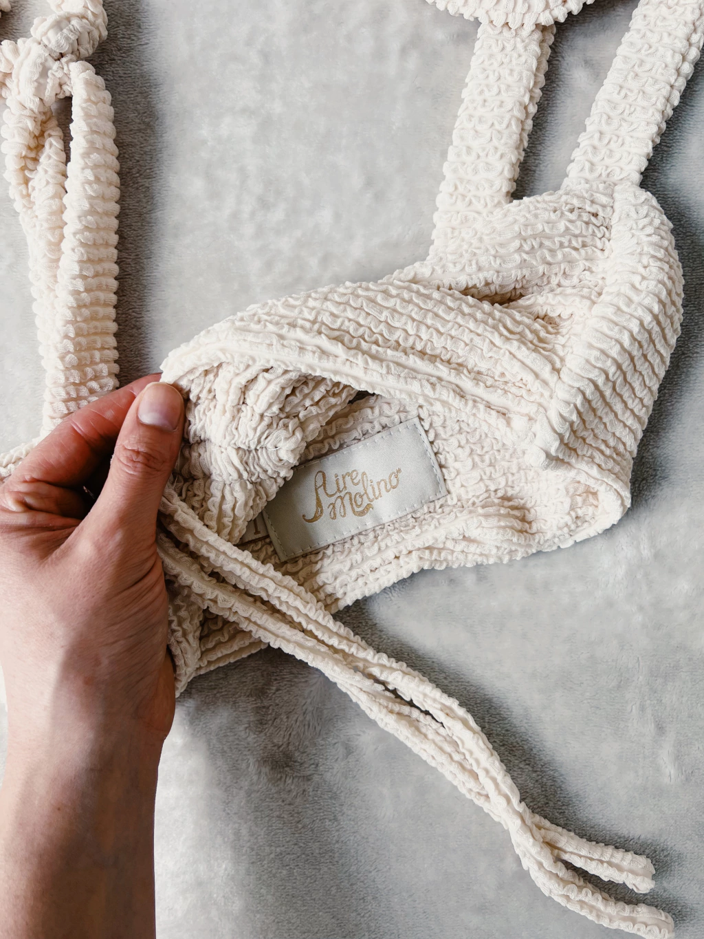 La prenda fué confeccionada en Mar del Plata. Es un top con breteles anchos (el ancho del brete también progresiona en los talles mas grandes), está forrado con al misma tela del frente, lo que hace que tenga mucho soporte. Es un modelo que sostiene muy bien tanto en los talles chicos como en los grandes. Tiene un cordón de la misma tela en el centro que frunce el escote según prefieras usarlo.