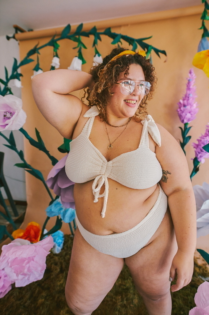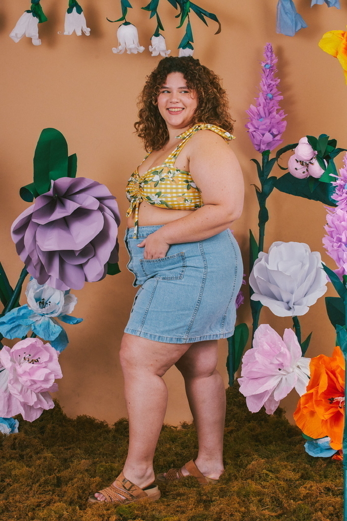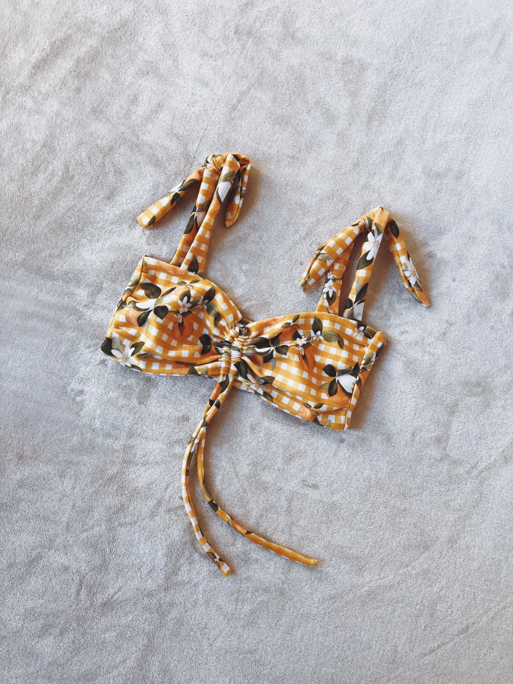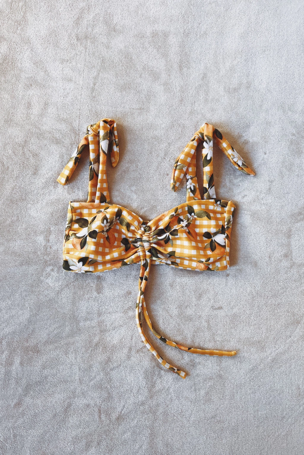 La prenda fué confeccionada en Mar del Plata. Es un top con breteles anchos (el ancho del brete también progresiona en los talles mas grandes), está forrado con al mnisma tela del frente, lo que hace que tenga mucho soporte. Es un modelo que sostiene muy bien tanto en los talles chicos como en los grandes. Tiene un cordón de la misma tela en el centro que frunce el escote según prefieras usarlo.