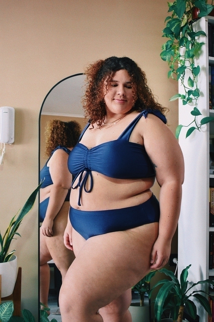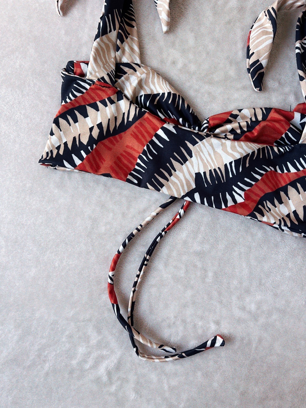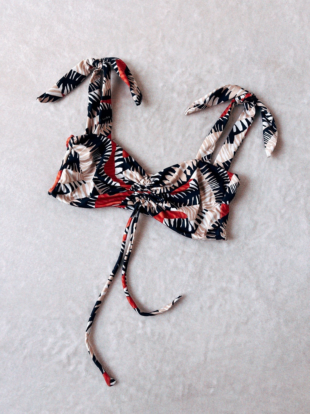 La prenda fué confeccionada en Mar del Plata. Es un top con breteles anchos (el ancho del brete también progresiona en los talles mas grandes), está forrado con al mnisma tela del frente, lo que hace que tenga mucho soporte. Es un modelo que sostiene muy bien tanto en los talles chicos como en los grandes. Tiene un cordón de la misma tela en el centro que frunce el escote según prefieras usarlo.