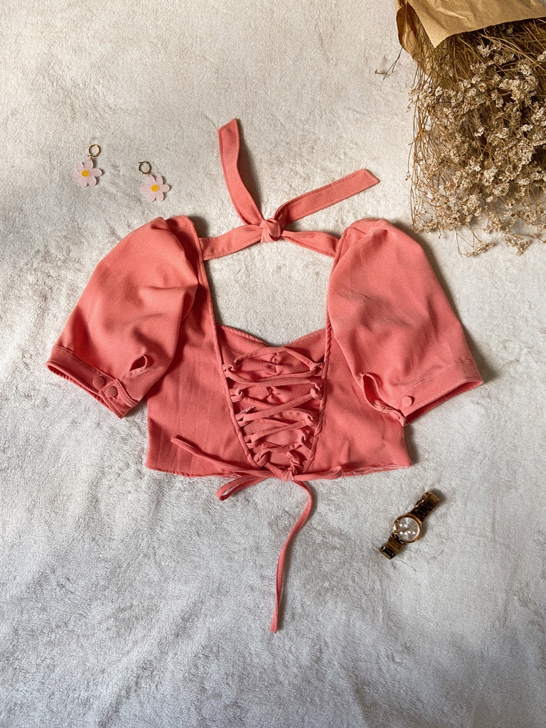 El top tiene dos medidas en el puño para que lo cierres con la que te quede más cómodo. Se ata en el cuello con dos lazos, y en la espalda se regula la medida con una tira. La delantera es de tela doble para que tenga más soporte. Realmente es muy cómodo y es un formato de escote que planeamos repetir mucho este año :)