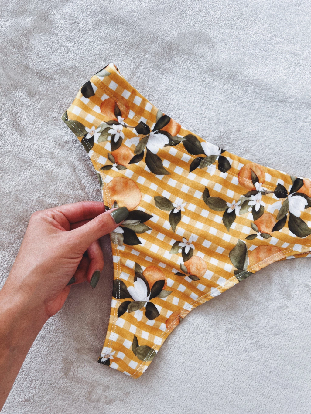 La prenda fué confeccionada en Mar del Plata. El corte es tipo vedetina tiro alto, el molde está diseñado para seguir la forma del cuerpo en el calce trasero. El elástico de la cintura es ancho, de 2,5 cms.