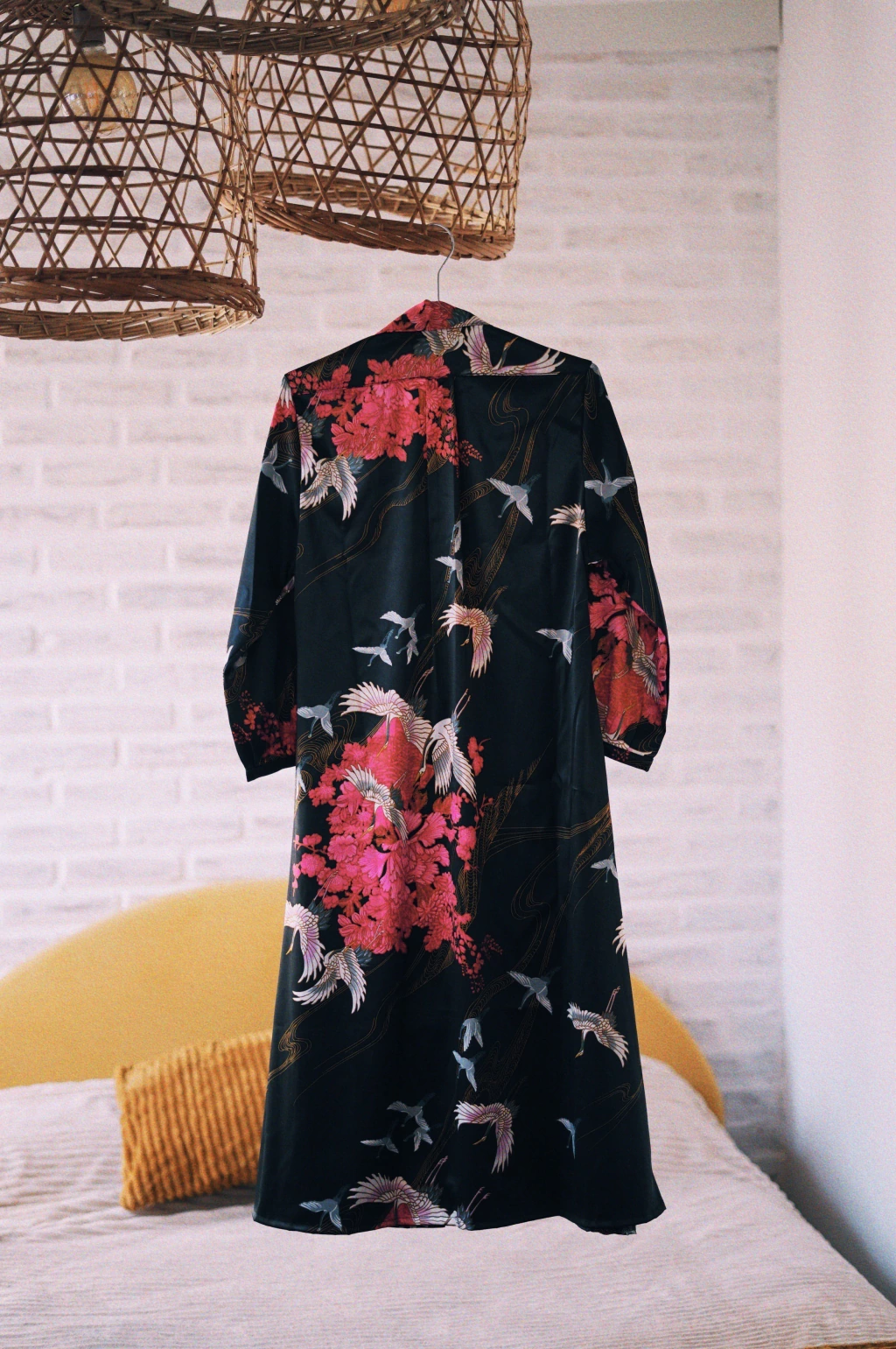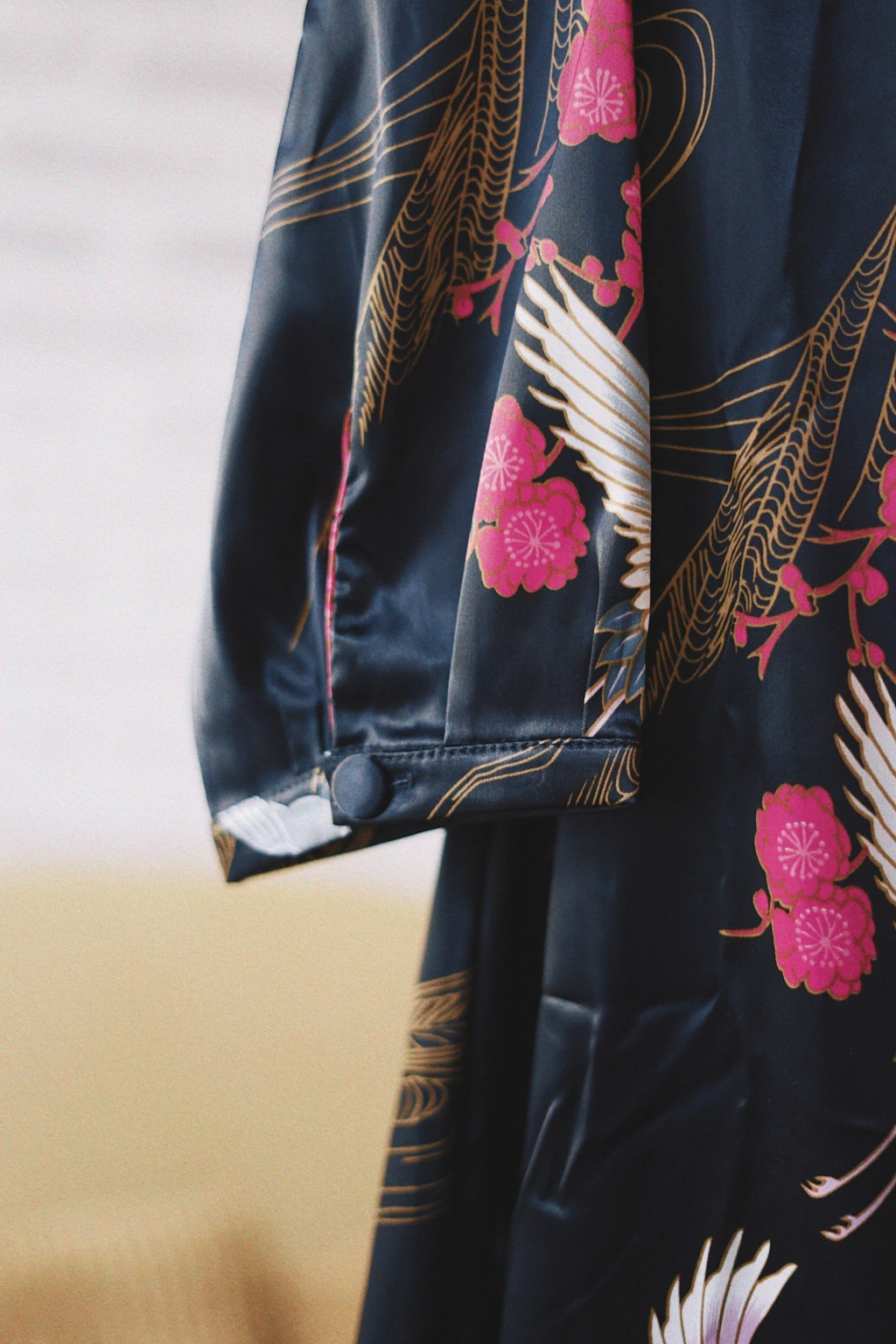 Vestido de seda bomber estampada. Se cierra con botones tipo broche perla en el centro.