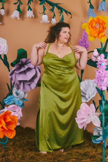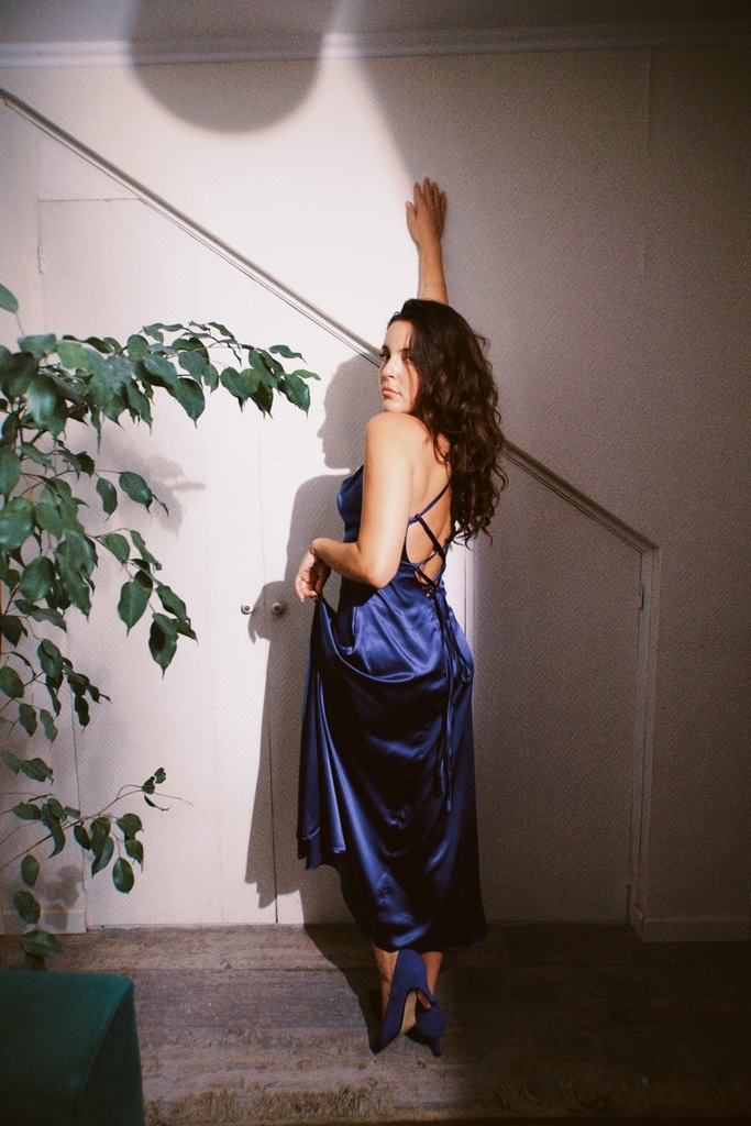 Este vestido pertenece a nuestra línea "hecho a mano" la cual está cortada pieza por pieza a mano para asegurarse que las prendas tengan una correcta caída, y luego confeccionado por la talentosa Belen, que tiene su taller en mar del plata.