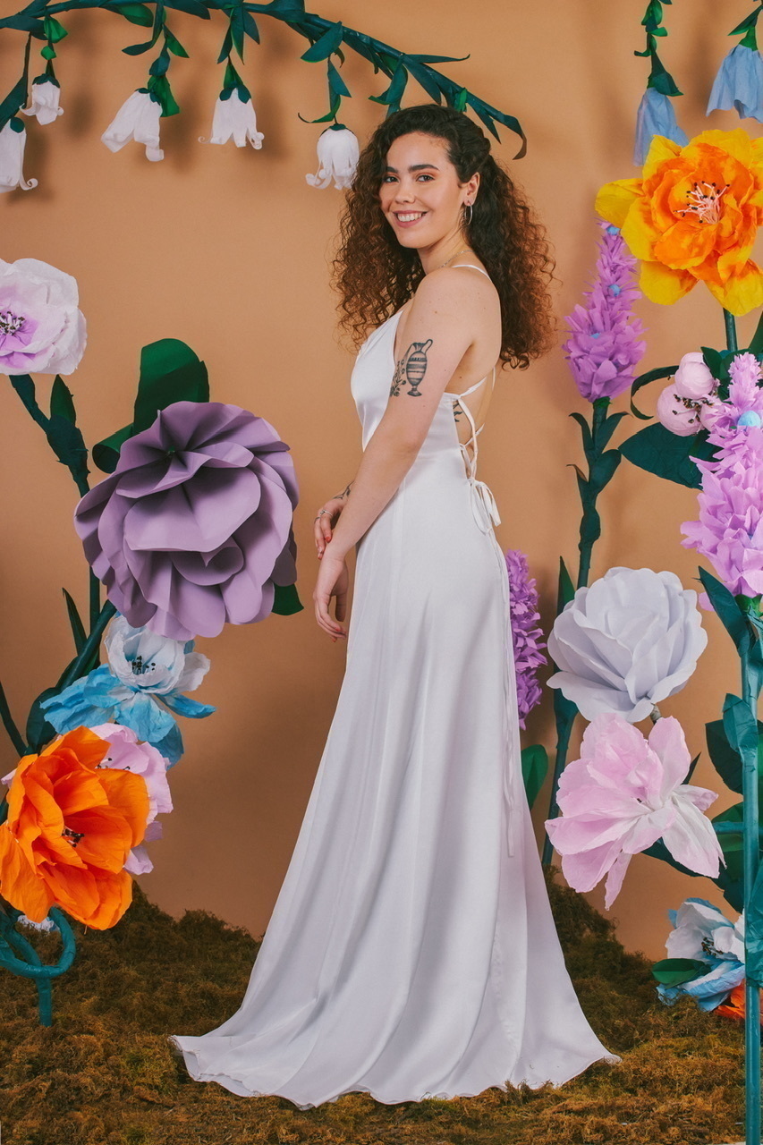 Vestido de satén con buche, y tiras en la espalda. Viene en 5 talles y cada talle tiene un corte espectacular (hicimos muchas muestras para lograrlo asi que pienso comunicarlo siempre que pueda).